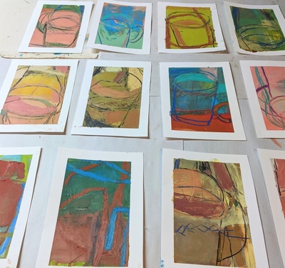 My work is process driven and mostly created with no preconceived idea. I work from intuition and through exploration of various materials including oil and cold wax, collage, mixed media, charcoal and water based paint. I use palatte knives, oil sticks, brushes, scrapers and various mark making tools. With oil and wax, I make marks and often add, rework and subtract layers of paint over days, weeks or months and think about the result later. I also create more immediate and less time intensive work based on mark making.